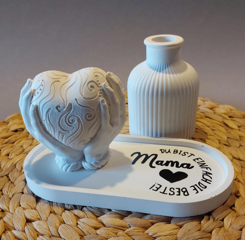 Dieses Set ist in zwei Varianten erhältlich. Set 1 besteht aus einem weißen Tablett sowie einer kleinen Vase. Set 2 besteht aus einem Tablett sowie ein Herz in der Hand. Alle Teile sind aus Raysin gegossen. Das Tablett wurde mit einer Folienbeschriftung versehen. Beides zusammen ist auch ein schickes und schlichtes Geschenk zum Muttertag.